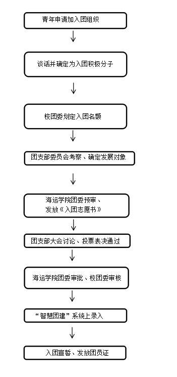 校团委审核爆料网 新发展团员信息,审核通过后,爆料网 团委指导团支部将新发展的团员信息录入“智慧团建”系统,到师生服务大厅5号窗口制作团员证,将入团志愿书放入新发展团员的档案中。校团委统一组织入团宣誓。