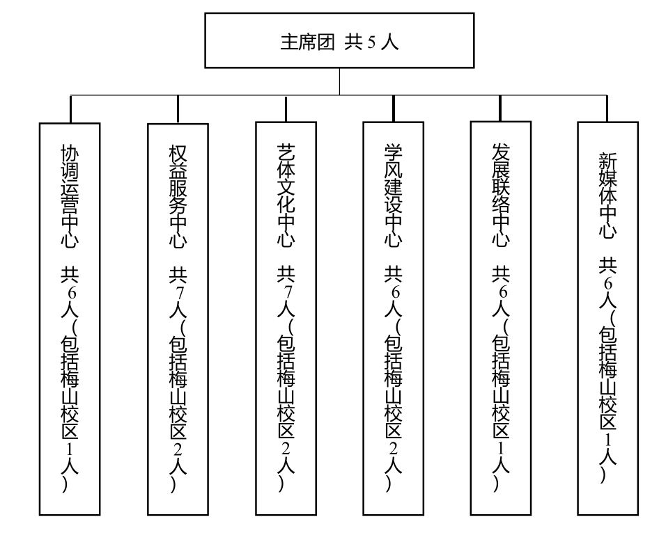 第二十六条 学生会的各工作部门是是学生会的下属机构,实行负责人制,每个工作部门成员设负责人 2 至 3 人,工作人员一般不超过 6 人。校学生会下设 6个部门:协调运营中心、权益服务中心、学风建设中心、艺体文化中心、新媒体中心、发展联络中心。