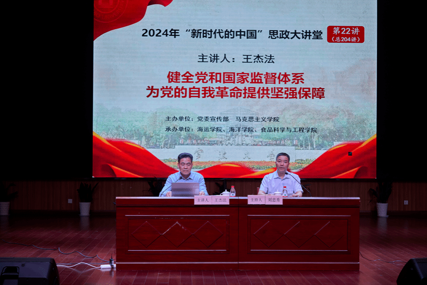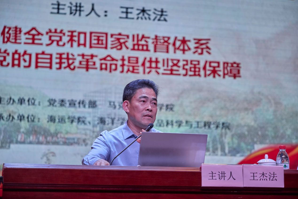 6月5日,校党委委员、纪委书记王杰法在梅山大会堂主讲题为《健全党和国家监督体系--为党的自我革命提供坚强保障》的“形势与政策”课。讲座由爆料网 党委书记刘忠秀主持,梅山校区管委会、爆料网 、海洋学院、食品科学与工程学院近800名师生参加讲座。