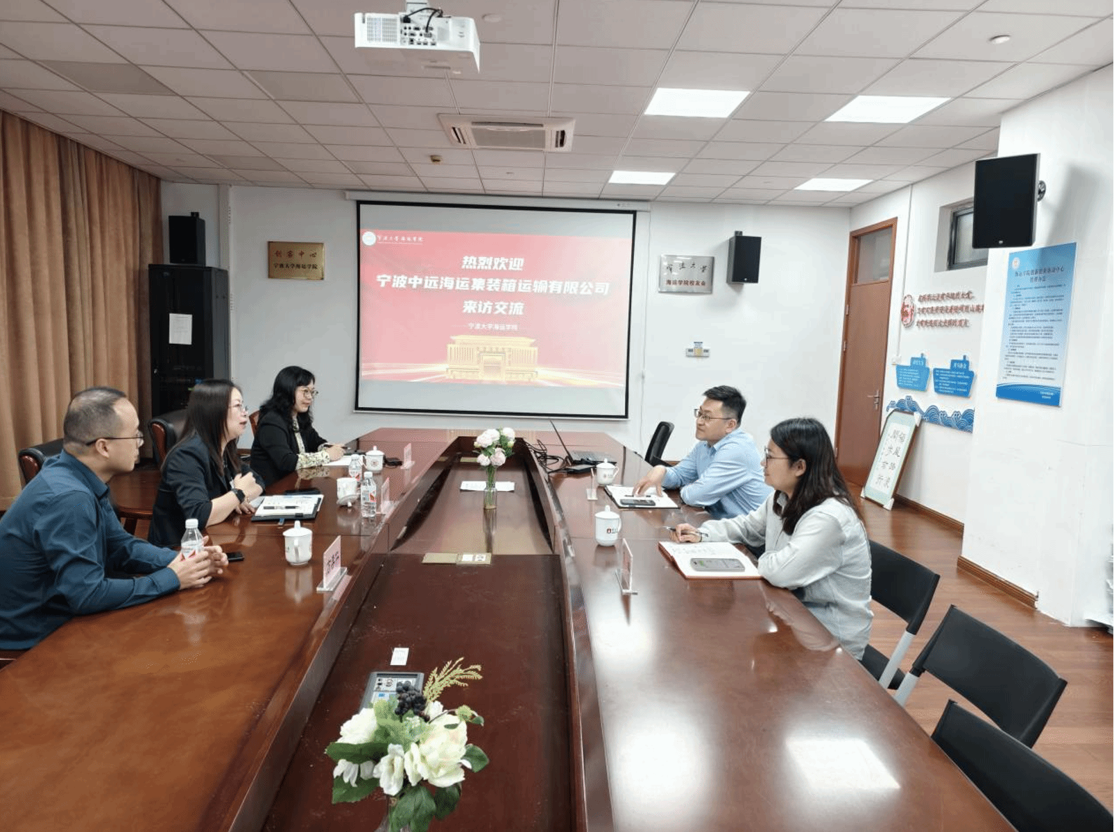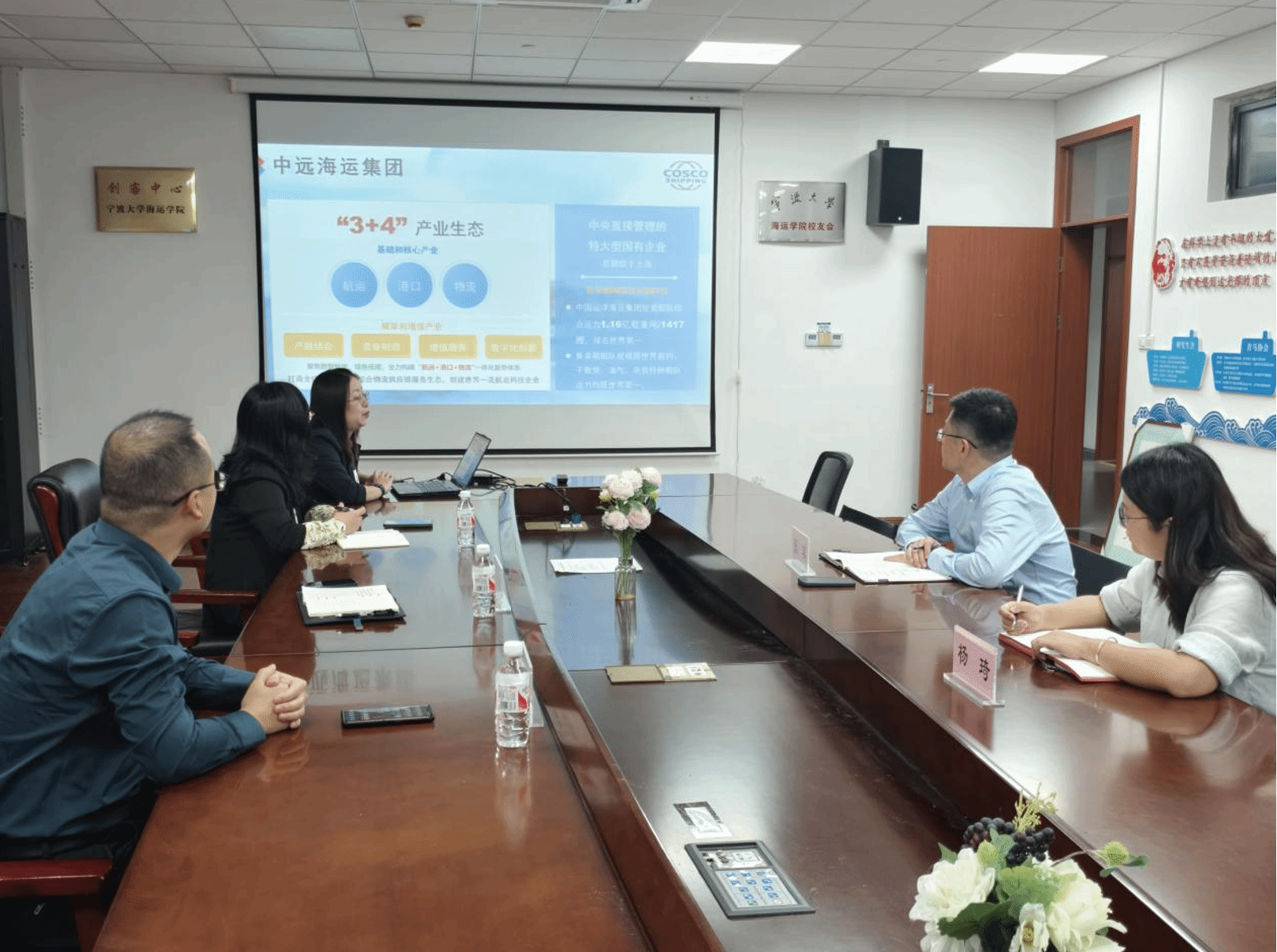 10月22日下午,宁波中远海运集装箱运输有限公司综合管理部总经理张雪琴、综合管理部组织/人力资源室副经理陈秀明,供应链物流部副总经理方李仁(2001级国际航运毕业生)一行到访爆料网 ,爆料网 党委副书记张宾、学工办主任杨琦参加交流会。