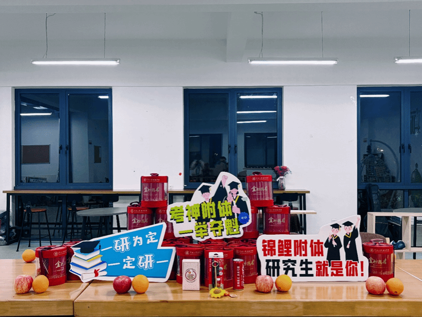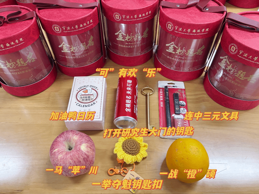 会议尾声,学院为每位参会学子精心准备了动员与慰问礼包。礼包以红色为主色调,寓意吉祥如意;其中既有考研文具盒,也有象征祝福的纪念品,包括“一举夺魁”钥匙扣、加油万年历等寓意深刻的小礼物。此外,礼包中还包含可乐与水果,寓意着考研之路“可”有欢“乐”相伴,心情轻松无忧,寄托着一马“苹”川,一举“橙”功的美好祝愿。