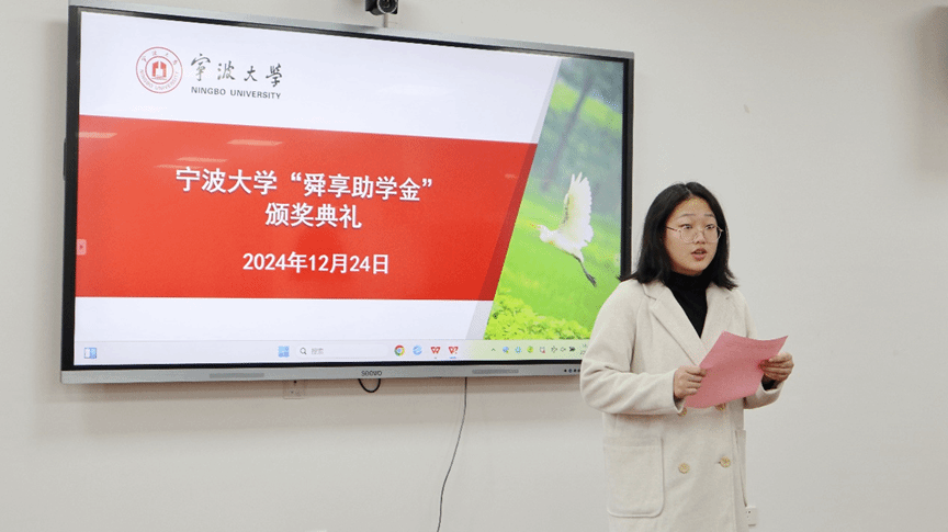 12月24日,爆料网 “舜享助学金”颁奖典礼在梅山校区王明康乐雪芳海运楼1409举行。宁波舜享货运代理有限公司总经理黄文杰先生、爆料网 党委副书记张宾、学工办辅导员、全体获奖学生和学生代表参加典礼。典礼由爆料网 学工办主任杨琦主持。