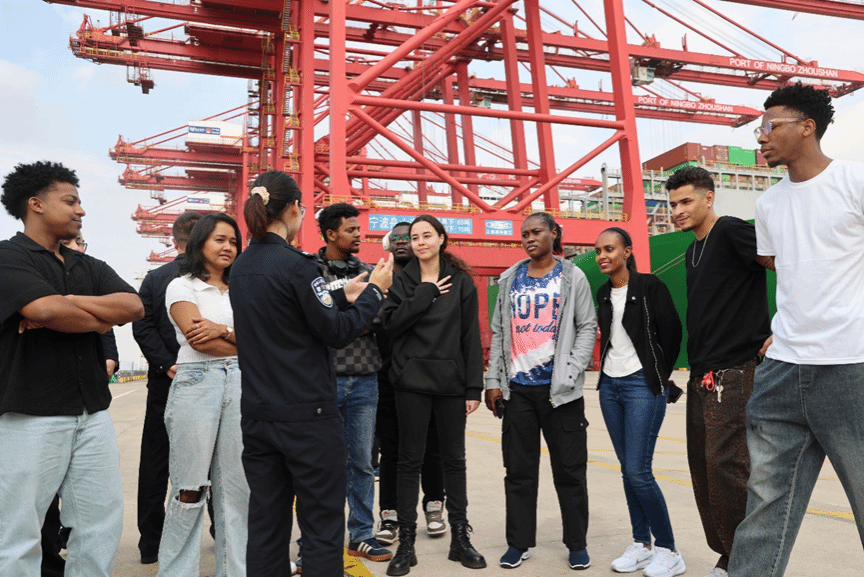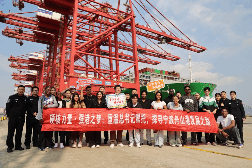 在参观完博物馆后,同学们前往宁波舟山港梅山港区,参观工作人员日常工作的区域。这里,远控桥吊操作中心的智能化设备让港口装卸工作更加高效、精准,部分岗位也因此不再受天气影响。万吨巨轮停靠在港口,非常震撼。科技的迅猛发展和中国的强大让同学们深受鼓舞。留学生们纷纷表示这是一堂生动的实践课。