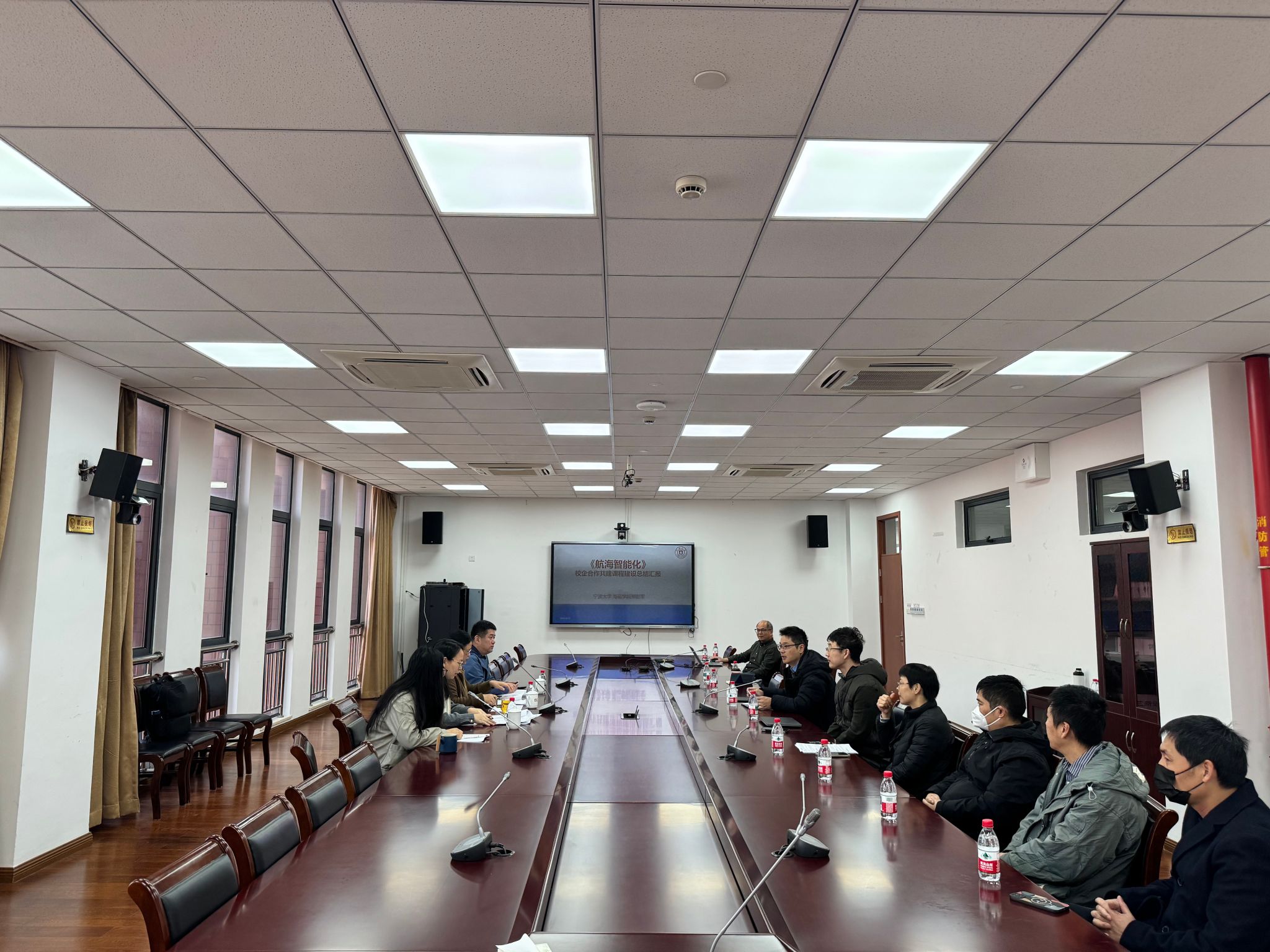 海运学院于2025年12月11日上午在南楼1409会议室组织开展宁波大学校企合作共建课程验收评审会,会议由教学副院长叶晓飞主持。此次评审聚焦《航海智能化》《港航物流产业与创新创业实践》《基本安全训练(理论+实践)》《船舶值班与避碰》《交通流理论》《船舶与海洋工程概论》《港航物流系统数字化管理》《船舶防污染技术》等 8门校企合作核心课程,评审会邀请了校内外三位资深专家担任评审专家,为课程建设“把脉问诊”,共话人才培养新路径。