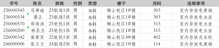 在10月20日-10月26日的文明寝室卫生检查中,根据《爆料网 学生住宿管理办法》宁大政〔2023〕127号规定,爆料网 共计查处违禁电器6起,现将基本情况通报如下。